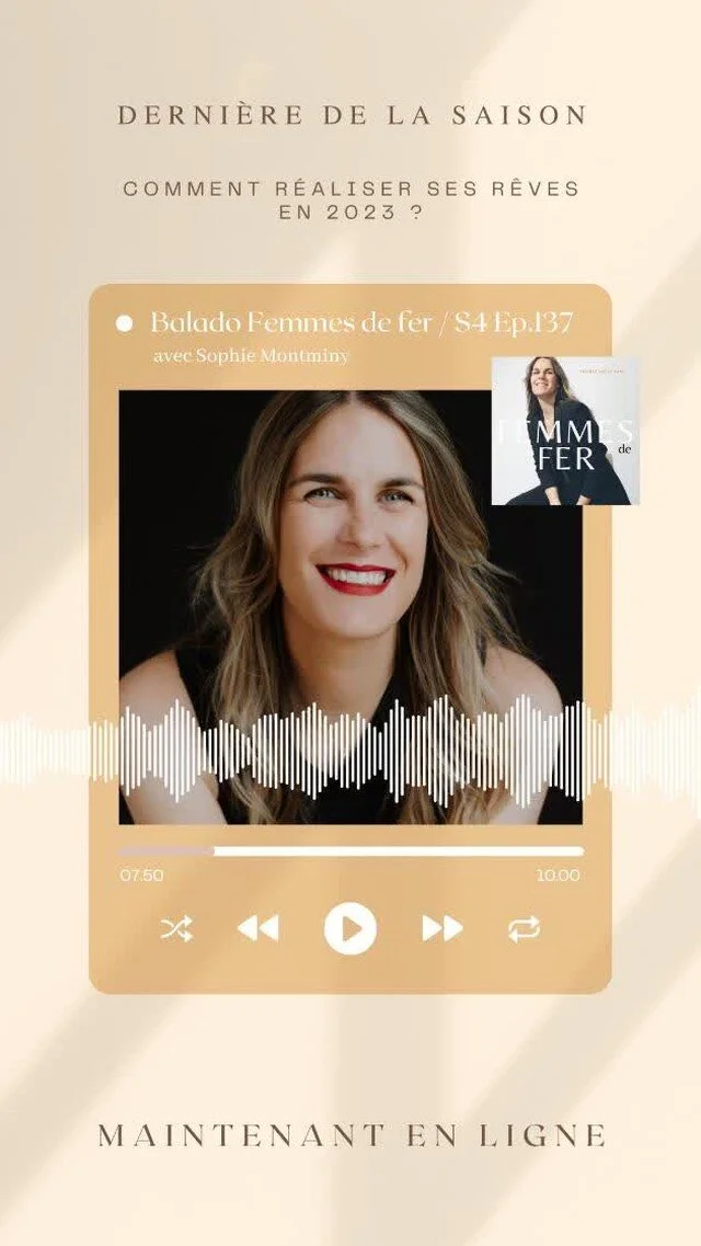 En 2022, j’entame la 4e saison du podcast Femmes de fer qui met de l’avant des femmes qui décident de changer les choses dans leur carrière, leur communauté ou dans le monde. C’est des discussions incroyables qui inspirent à se surpasser et qui nous font grandir en tant qu’humain. Vous pouvez l’écoutez sur Apple Podcast, Spotify, YouTube, etc.