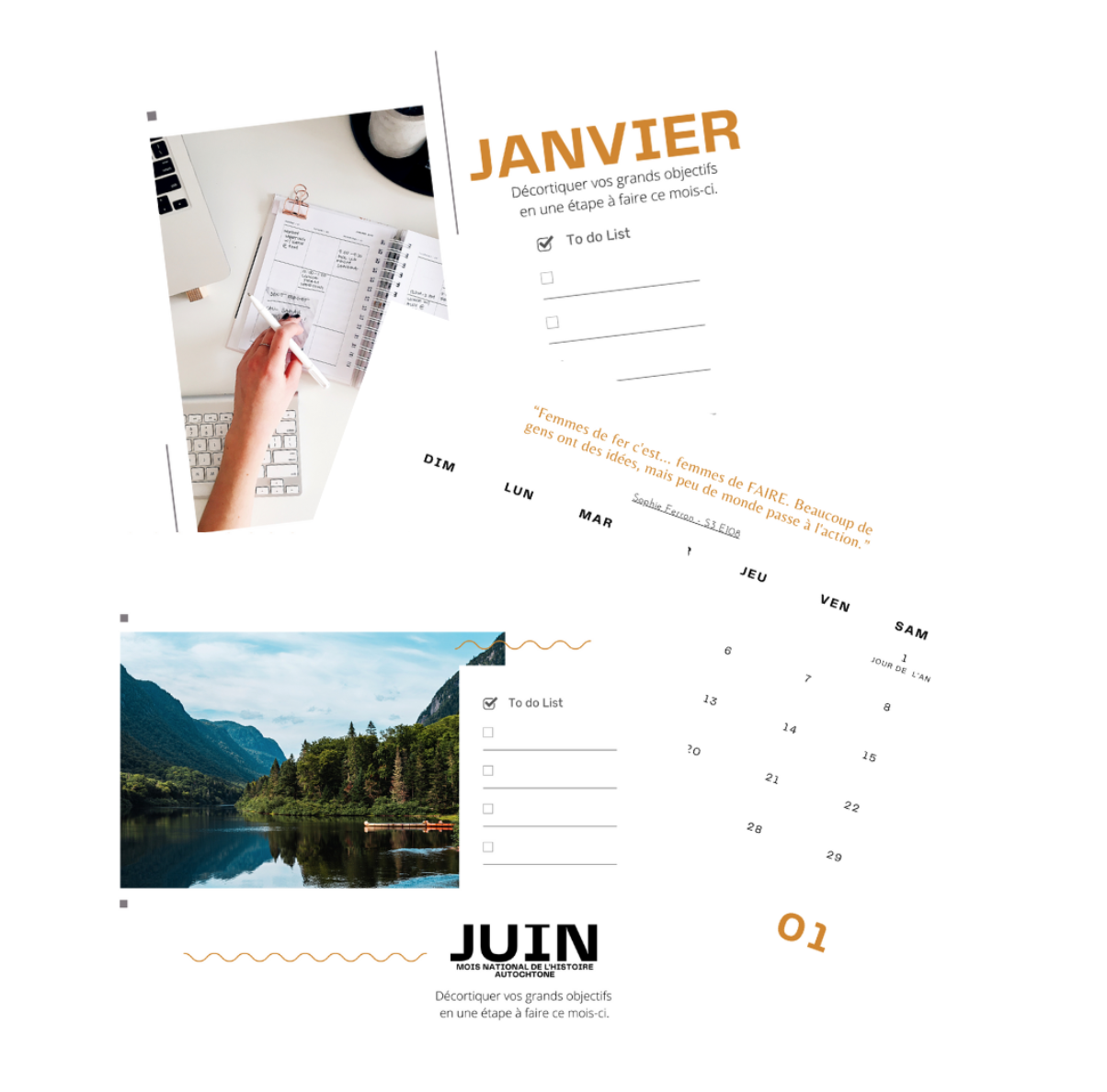 À la recherche d’un calendrier de production efficace et inspirant ? Découvrez le calendrier de Femmes de fer 2022 ici. Il vous aide à écrire vos rêves, vos objectifs et vous amène à suivre votre évolution au quotidien.